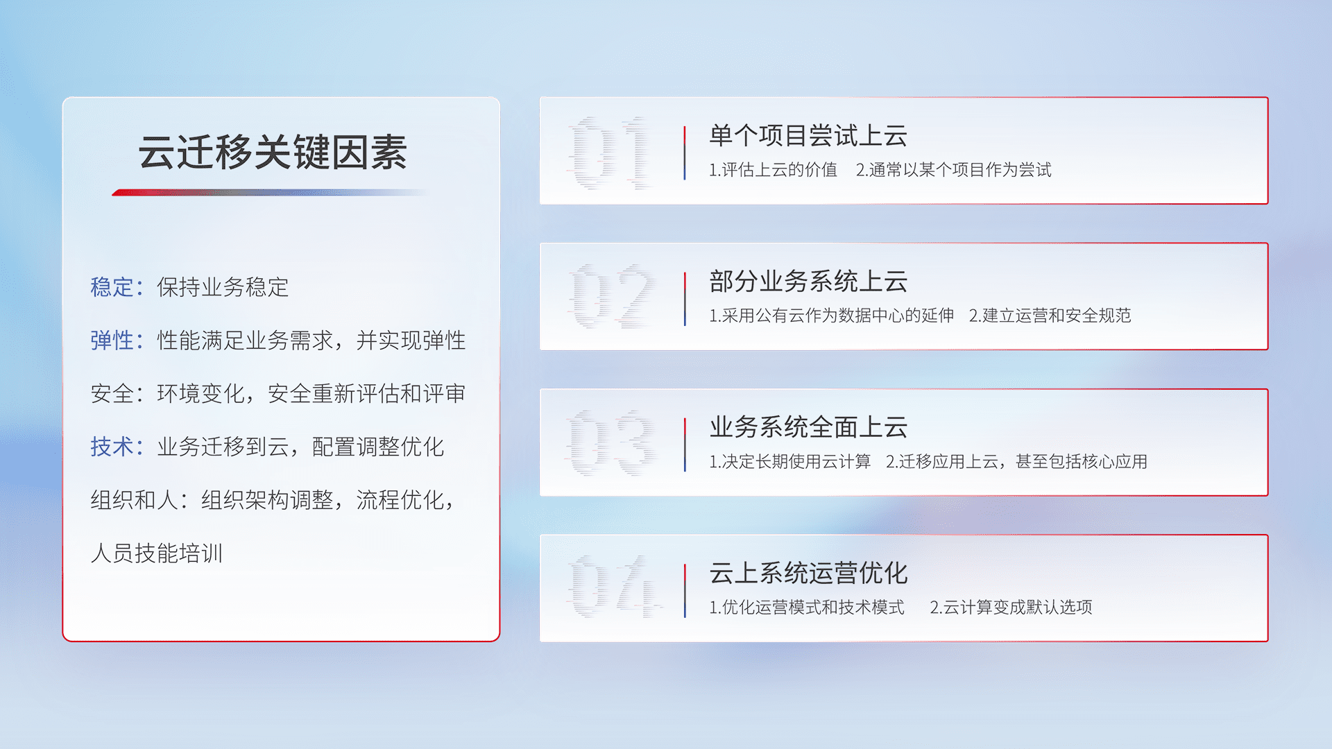 结合实际业务,,,,从规划设计、、、、云平台选型、、云原生改造、、数据迁移、、、集成交付,,迁移全过程为客户识别最佳上云路径,,,做好风险识别管理,,设计网络架构、、、、身份权限、、、安全审计合规、、操作审计、、、、日志审计、、、监控告警策略、、、多站点容灾设计等,,,,对云上基础设施进行整体规划,,,提升IT治理水平,,,,以满足弹性、、、、高可用、、、、高性能的需求。。。