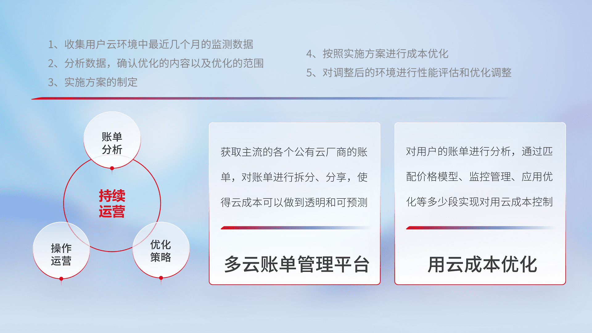通过多云纳管,,以统一的资源数据模型把客户的云资源进行抽象和封装,,,进而实现对多云资源的统一操作,,,保障云资源管理的可靠性、、稳定性与可用性。。。量身定制化运维内容,,,配置、、、、开发运维、、、补丁管理、、备份、、监控、、、认证和访问管理、、、、审计和日常巡检等,,保障在用云过程中的可靠度,,,,稳定度以及高可用率。。。。